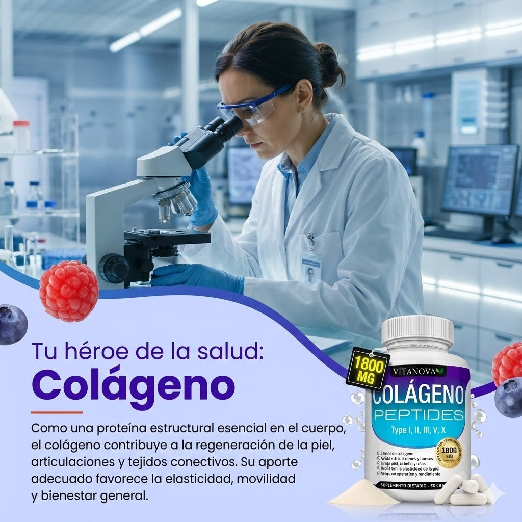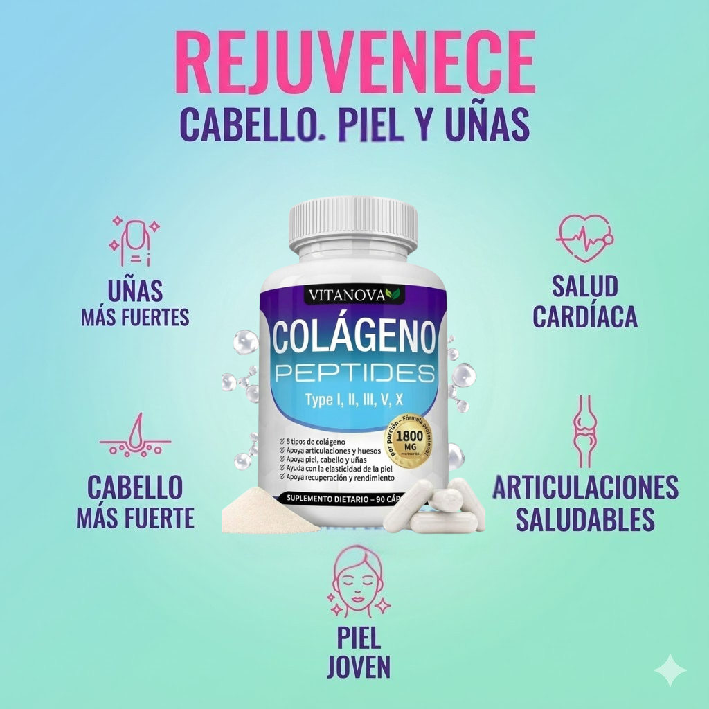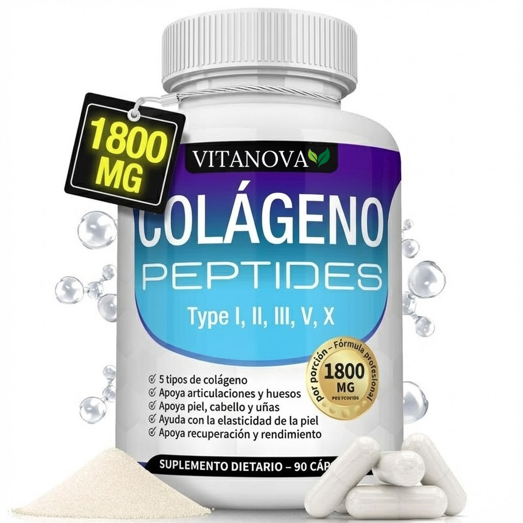 Vitanova Colágeno es un suplemento premium formulado con péptidos bioactivos de Colágeno Tipo I, II, III, V y X. Diseñado para apoyar la regeneración natural de la piel, fortalecer el cabello y las uñas, y promover articulaciones más saludables.Con una fórmula avanzada respaldada por la ciencia, ideal para cuidar tu belleza y bienestar desde adentro 💖.